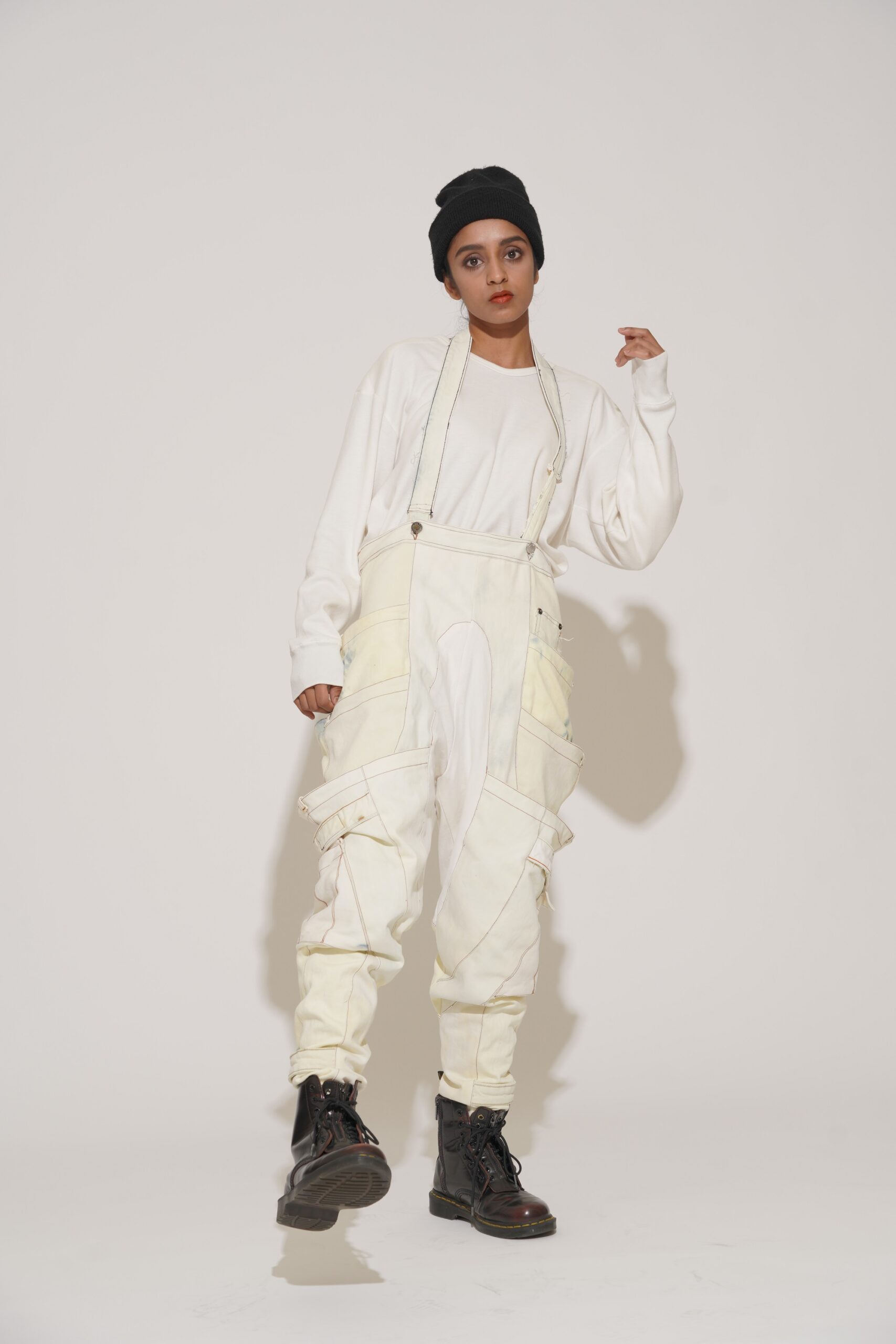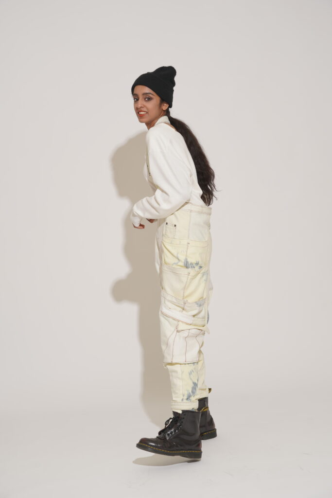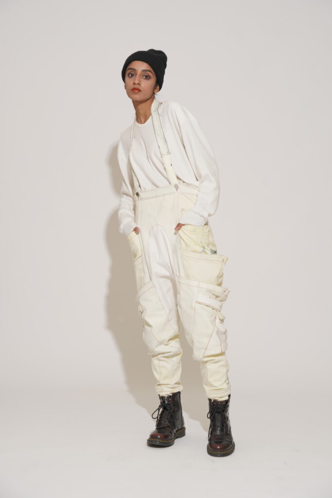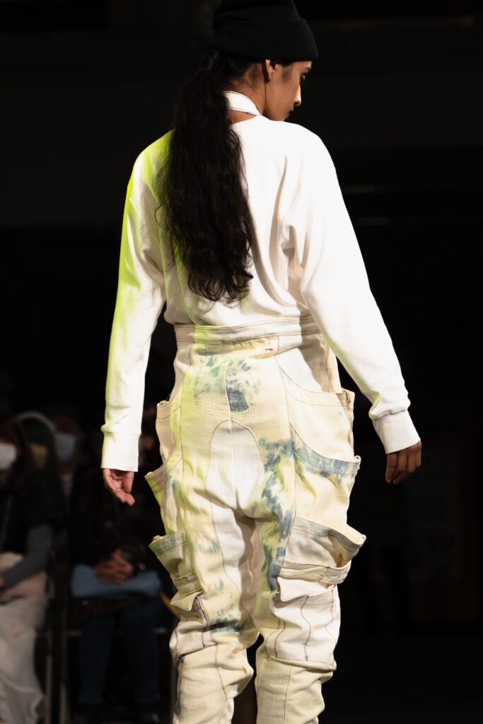 作家さんの作業着にしたいという思いから、様々な大きさのポケットをたくさんの場所に配置し、色々なものがいれられるようにしたことがこの作品のポイントです。