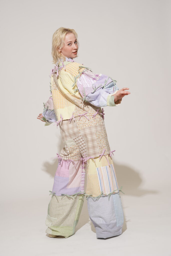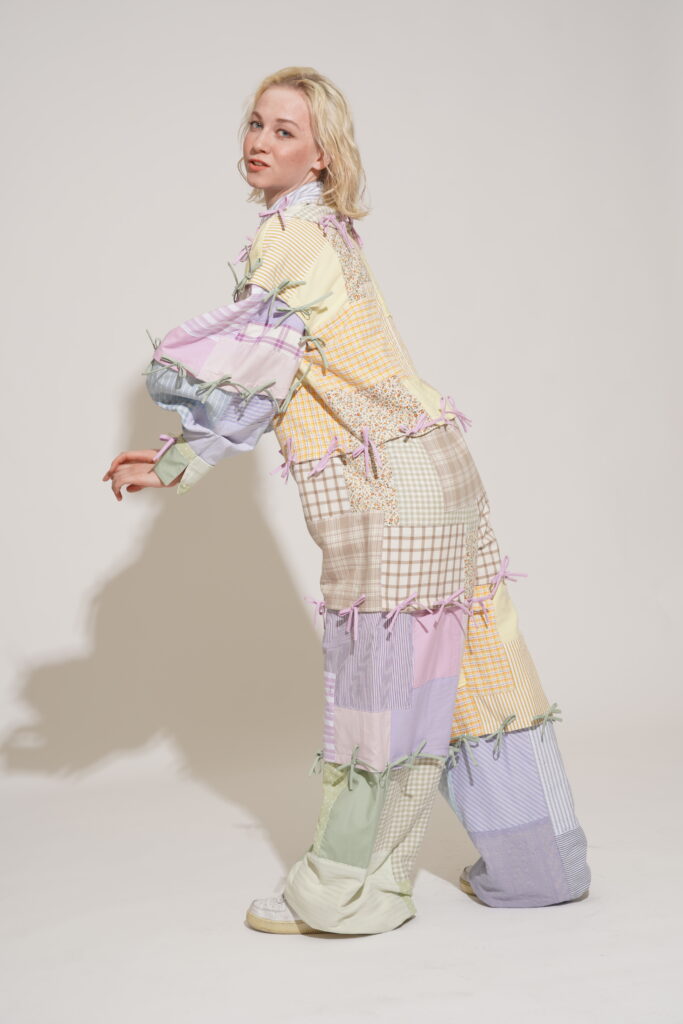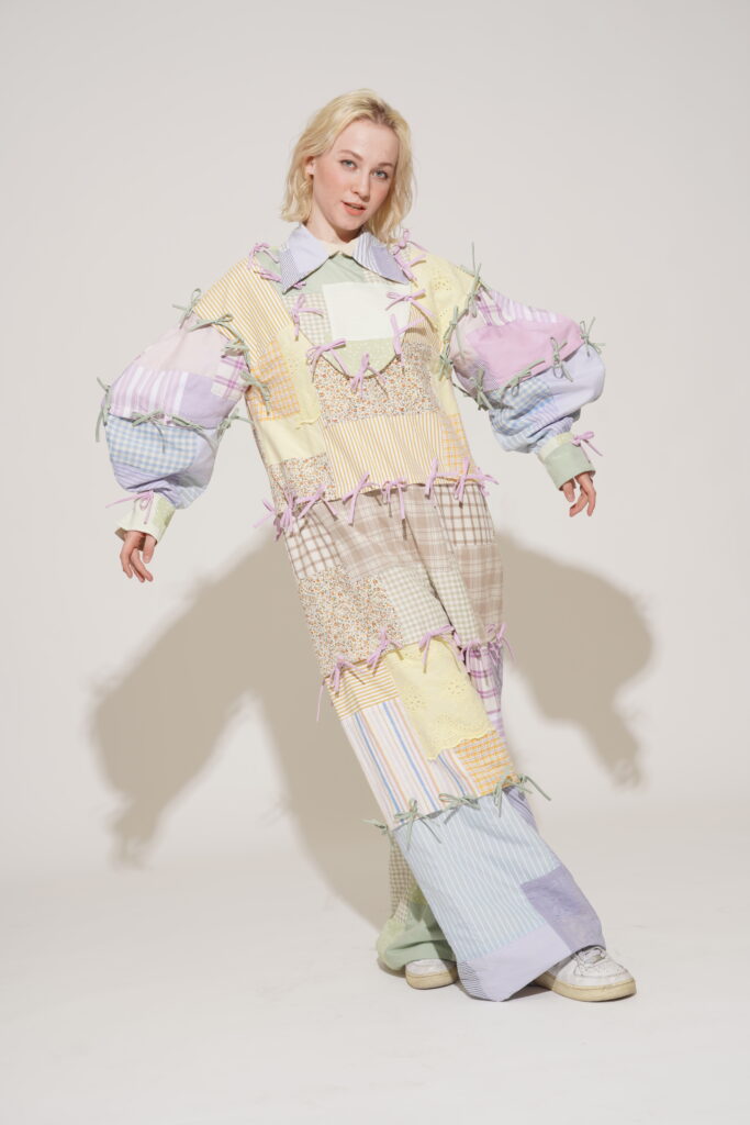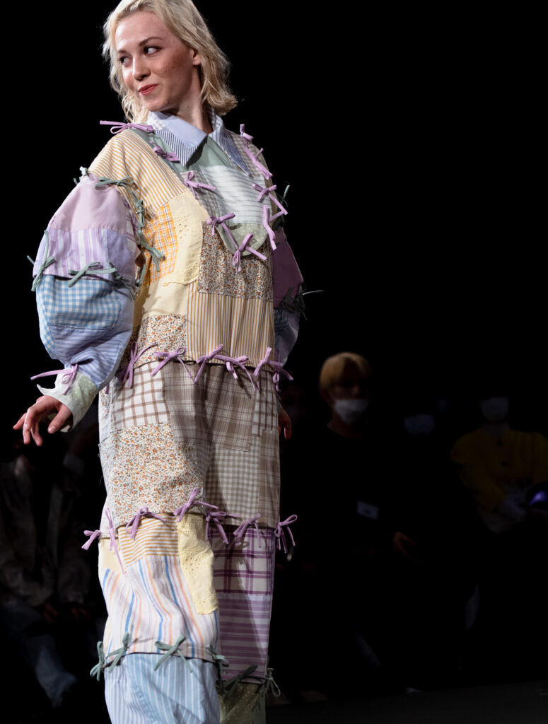 リメイクを通して『過去のファッションを未来に繋いでいきたい!』という思いと、大切なものは自分の手を使って直接つなぎたいという思いから、パーツとパーツを自らの手でリボン結びすることで『つなぐ』が完成するように作られた作品です。リボンをほどくことで、様々な形に変えることができます。
