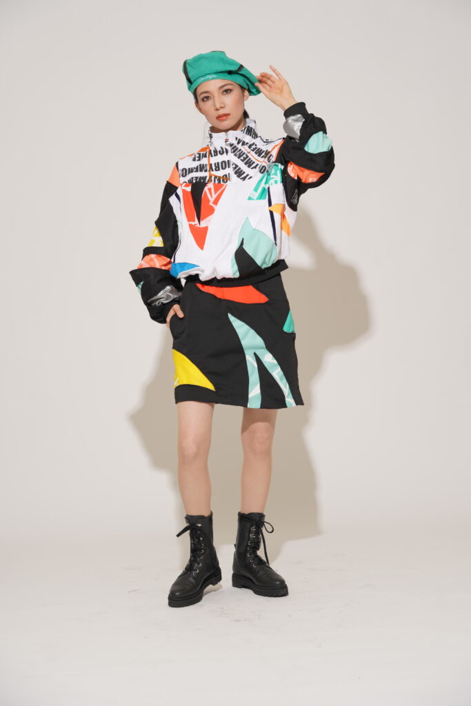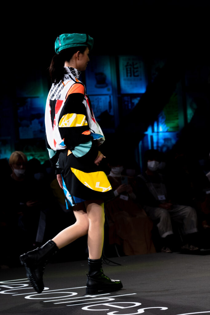 『古着の思い出』を想像し、シルクスクリーンでアルバムが重なっているイメージに。カラフルな色合いで、『想い出』を走馬灯のように思い出していることを表現しています。また、素材にはリサイクルできないナイロンとポリエステルをあえて使用し、環境問題も考慮して制作しました。